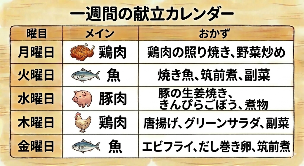 - 曜日ごとにメインを決めておく 「月曜日は鶏肉」「火曜日は魚」「水曜日は豚肉」というように、大まかなカテゴリーを決めておくだけで、買い物も調理もスムーズになります。