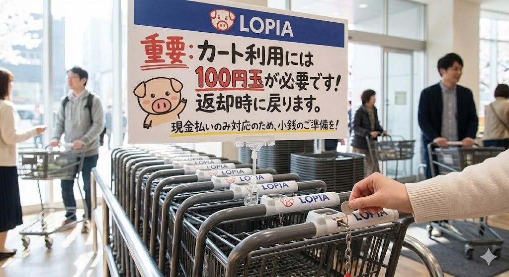 【カート置き場と「100円玉必須」の注意書き】