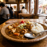 - バターチキンカレー(ナン&ライス付) スパイスの香りとバターのコクがたまらない本格派。小ぶりのライスとナンが両方楽しめるスタイルが定着しています。
