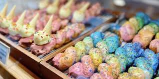 イチゴやシャインマスカット、みかんなどを薄い飴でコーティングしたフルーツ飴です。パリッとした食感と果汁のジューシーさがSNS映え抜群で、デザートの定番となっています。