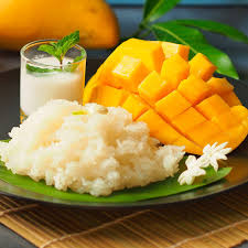 カオニャオ・マムアン(マンゴーともち米) 3月から5月にかけてマンゴーが最も旬を迎えます。甘い完熟マンゴーとココナッツミルクで炊いたもち米の組み合わせは、この時期の必須スイーツです。