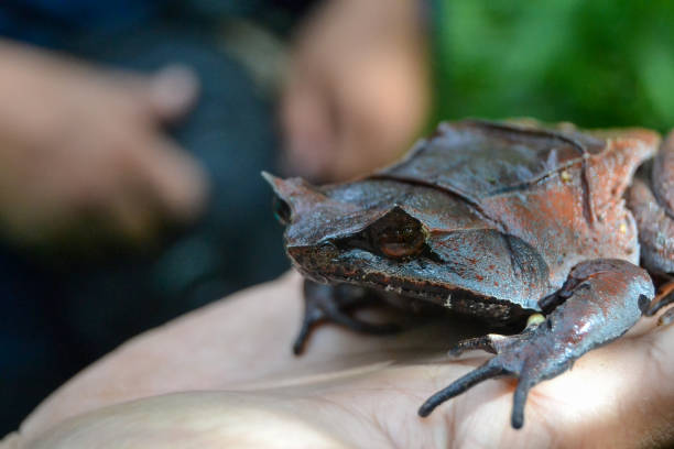 Closeup of a Surinam toad held in a human hand in a tropical rainforest environment. The toad is a fascinating and unusual amphibian with a unique appearance.