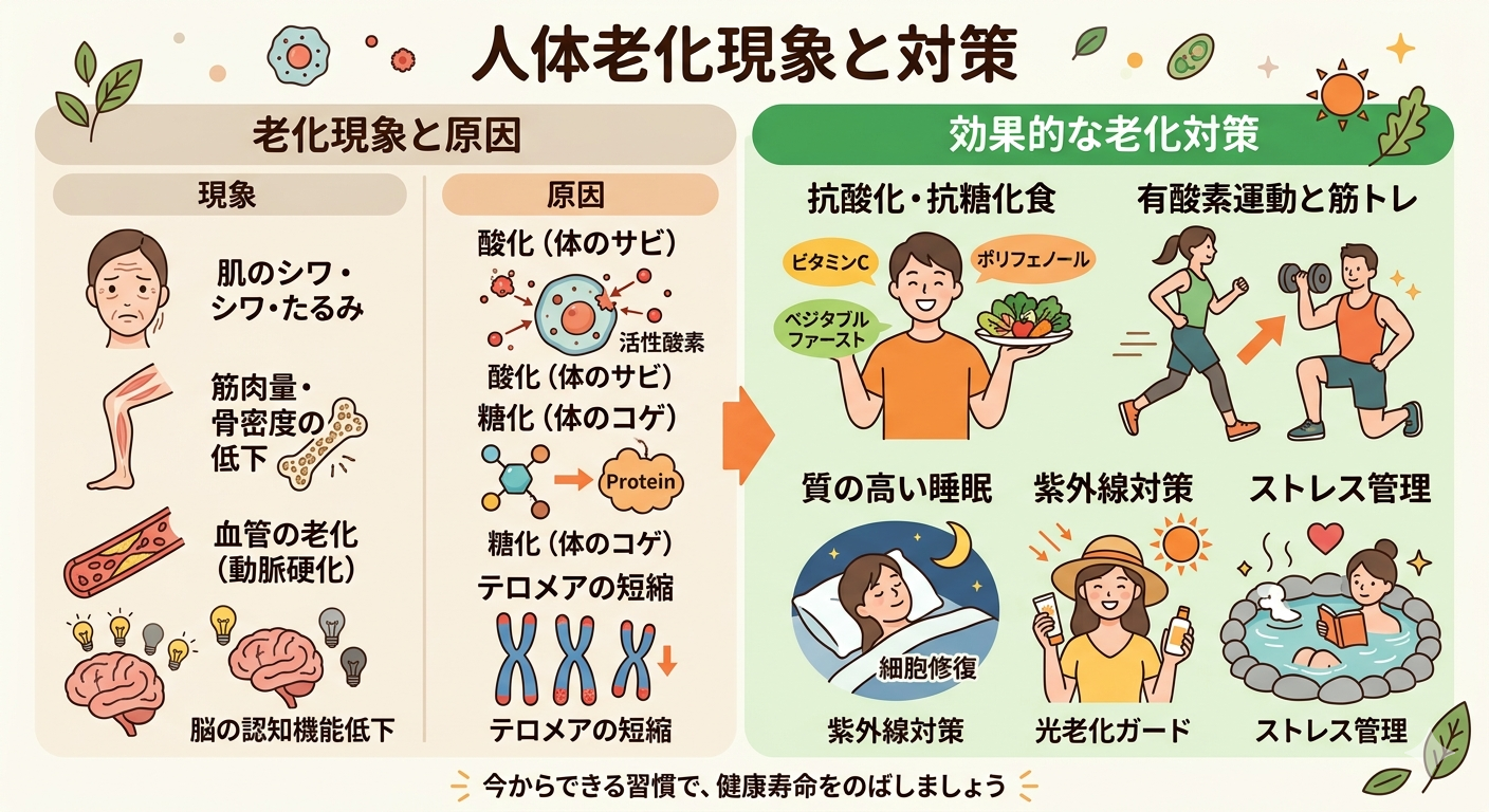 老化は避けて通れない自然なプロセスですが、その仕組みを理解することで、進行を緩やかにしたり、健康的な状態を長く維持したりすることが可能です。