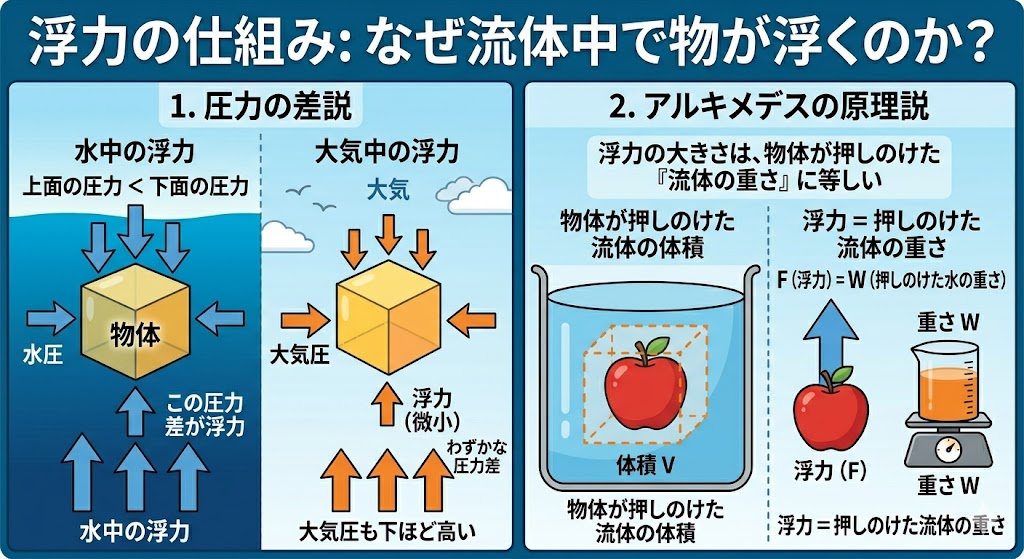 2. 押し上げる力: この「下から押し上げる力」が「上から抑えつける力」を上回ったとき、その差が浮力となります。
