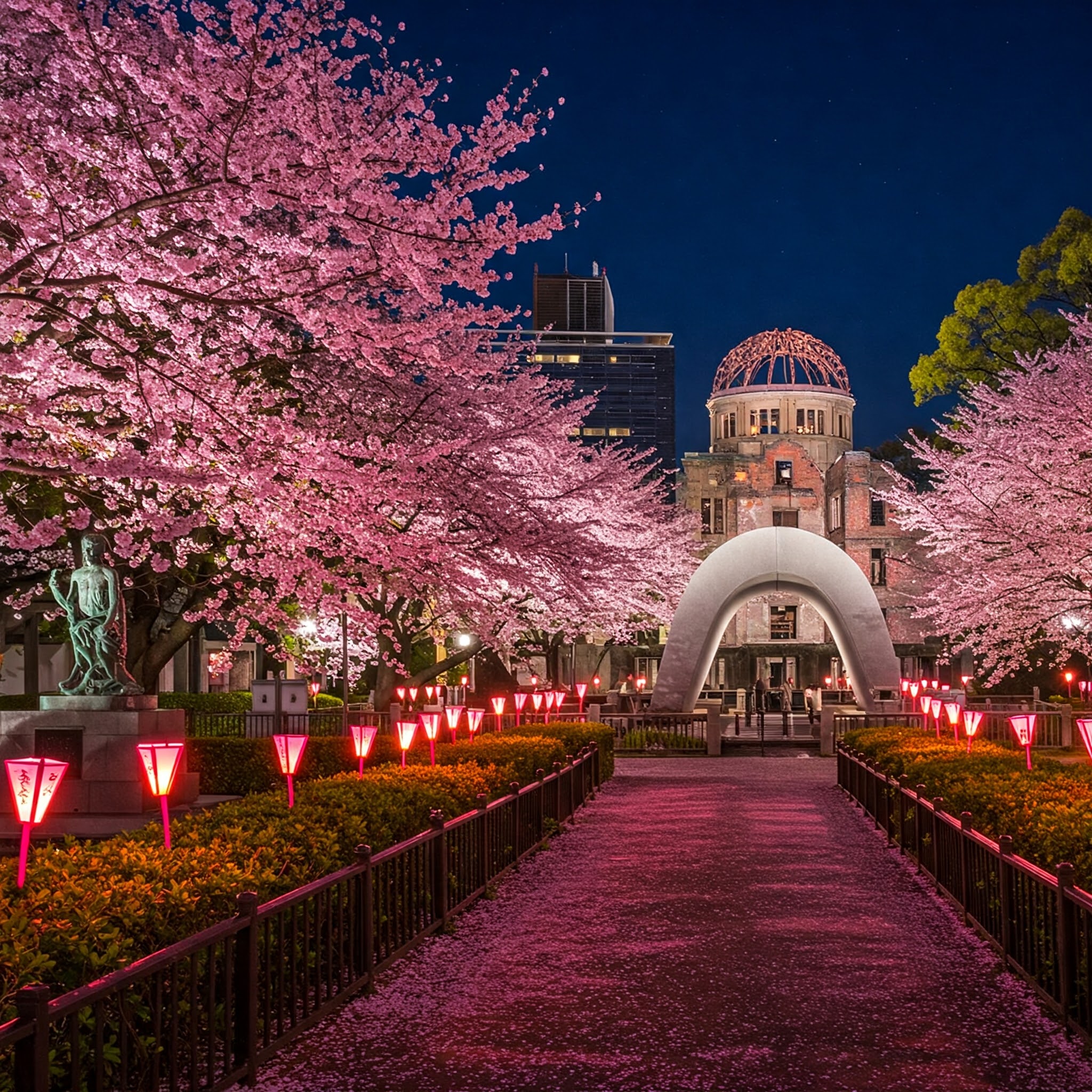 - 原爆ドームと桜のコントラストが美しい、平和を祈る公園。