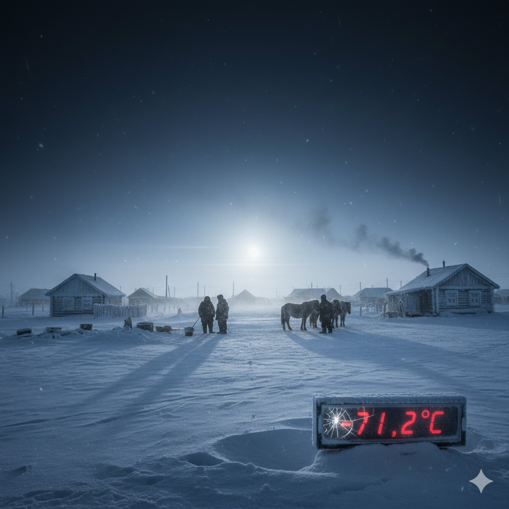 **地球上で最も寒い定住地(人が住む村)**として知られ、冬の平均気温も極めて低い。