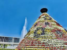 FFの象徴といえば、平和記念公園にそびえ立つ「花の塔」です。毎年デザインが変わるこの塔には、約8,000鉢もの花々が植えられ、その年のテーマを表現しています。