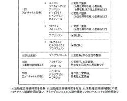 | I群 | Na(ナトリウム)チャネル遮断 | 心筋の興奮伝導を遅らせ、異常な電気信号を抑える | |